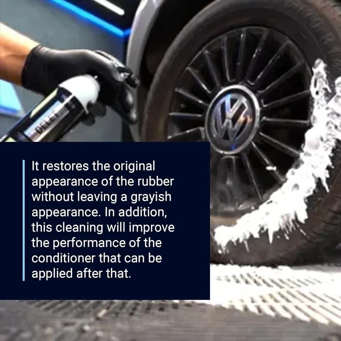 Delet הוא חומר ניקוי ייעודי לניקוי עמוק ויסודי של צמיגים וגומיות. הצמיגים והגומיות ברכב הם בעלי משטח שאיננו חלק, ומאפשר לבוץ, לכלוך ושאר מזהמים מהכביש להיטמע בתוכו ולפגוע במראה שלו. ה-Delet ימיס כימית את המזהמים מעומק הצמיג והגומי ויסייע לשחזר את המראה השחור והחדש, ויכין את המשטח בצורה אופטימלית ליישום הגנה באמצעות ה-Shiny או ה-Revox לצמיגים, וה-Resturax לגומיות.